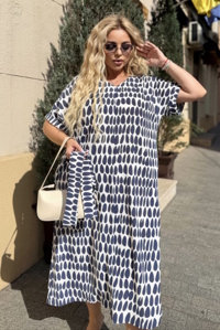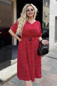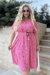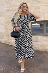 Сукня прямого, вільного силуету з цільнокроєними короткими рукавами, що мають відворот внизу. Виріз горловини V-подібної форми. У комплекті йде пояс, що дозволяє підкреслити талію та створити завершений образ.