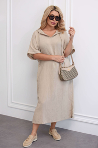 Жіноче плаття вільного крою з капюшоном. Воно виконане з легкої, натуральної тканини, що створює зручний і повітряний образ. Модель має короткі, трохи спущені рукави та дві накладні кишені з боків.