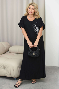 Довжина максі, внизу з боків розміщені розрізи для більшої свободи рухів. Образ можна доповнити кросівками, що надає йому спортивно-повсякденного акценту. Це ідеальний варіант для літніх прогулянок або неформальних зустрічей – зручний, стильний і водночас ненав’язливо елегантний.
