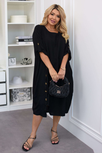 Декоративним елементом виступає ряд великих контрастних ґудзиків спереду, які йдуть від талії вниз, а також кишені, що додають практичності. Довжина моделі – міді, з розрізами з боків для зручності рухів. Це плаття виглядає комфортно, дихає завдяки натуральній тканині та чудово підійде як для міських прогулянок, так і для відпочинку.
