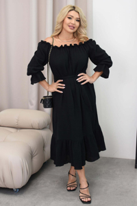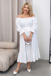 Розкішне легке плаття чудово підійде для спекотного літа. Модель виготовлена з повітряного мусліну. Довжина міді доходить до щиколотки. Виріз горловини на резинці, можна спокусливо оголяти плечі.