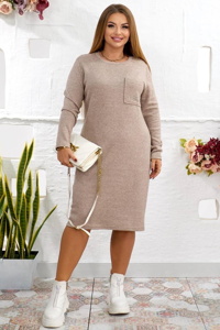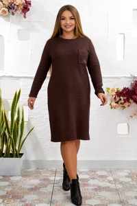 Сукня оснащена акуратним круглим вирізом та довгими рукавами, які додають образу лаконічності й тепла. На грудях — стильна накладна кишеня з делікатною вишивкою. Довжина міді робить модель універсальною.