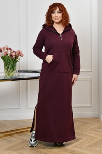 Позаду пошити капюшон - зручний і глибокий. Спереду розташована коротка блискавка, що забезпечує комфорт під час надягання сукні. Рукави реглан із манжетами додають зручності, а спереду нашита практична кишеня «кенгуру». Внизу з боків передбачені розрізи для свободи рухів і комфортної ходи.