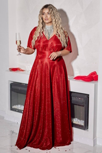 Модель з V-подібною горловиною, по талії широка вставка, що красиво її підкреслює. Спідниця А-подібна, приховує всі недоліки фігури, по спинці потайна блискавка.