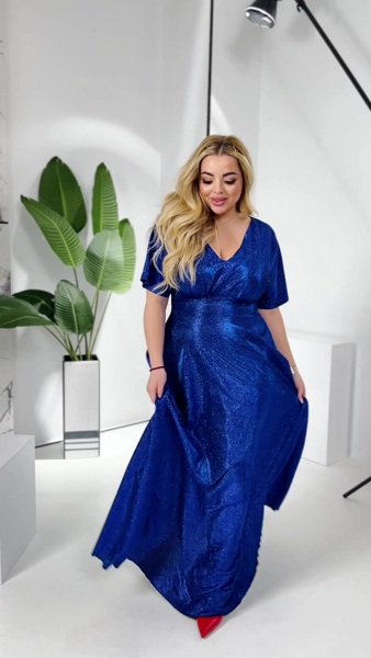 Плаття виглядає велично та розкішно завдяки тканині, що переливається.