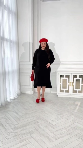Тепле в'язане плаття з акуратною округлою горловиною прямого силуету.
