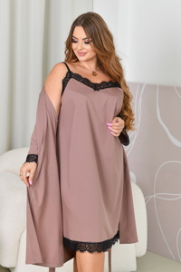 Комплект складається з халата та нічної сорочки. Халат на запах, доповнений поясом із основної тканини, має рукави 3/4, прикрашені мереживом, а також зручну накладну кишеню. Нічна сорочка на регульованих бретелях виконана у напівприталеному силуеті, акцентована вишуканим мереживом по лінії грудей та по низу виробу.