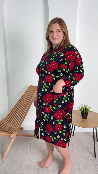 Халат представлений у насичених темних кольорах з яскравим квітковим принтом. . Виріб має зручну довжину до колін і рукави три чверті, що робить його комфортним для щоденного носіння вдома. Спереду застібка на блискавку. Також є пояс в комплекті.