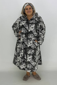 Модель вільного крою, на змфйці, вшитий капюшон. Пояс та пов'язка в комплекті.