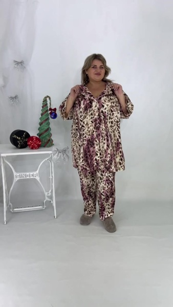 Домашній костюм-двійка, зшитий із гладкого атласу з яскравим леопардовим принтом. Тканина має м'який блиск, приємна до тіла та створює стильний, дорогий вигляд. Модель має вільний, розслаблений крій, що забезпечує комфортну посадку та м'яко приховує недоліки фігури. Сорочка має вільний силует з V-подібним вирізом горловини та невеликою застібкою на ґудзиках. Рукави ¾, широкі.