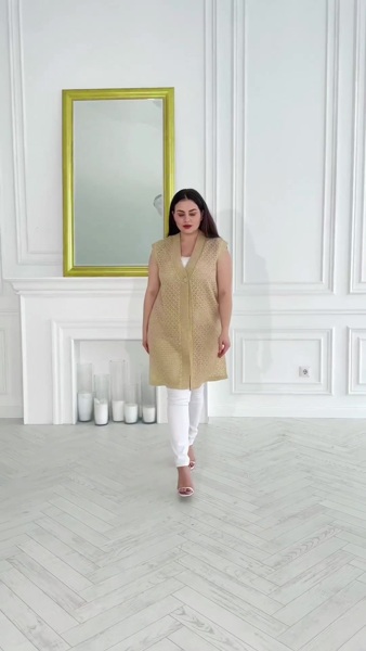 Застібка - один гудзик. Красива ажурна бавовняна в'язка двох видів. Комбінується з футболками, майками, блузками.