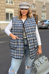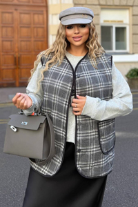 Тепла, стьобана жилетка прямого крою. Вона має картатий візерунок у різних відтінках. Жилетка без коміра, із застібкою на ґудзиках, та двома накладними кишенями спереду.