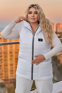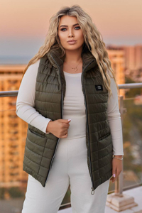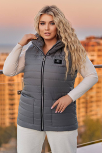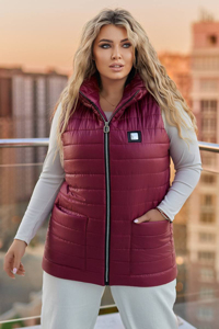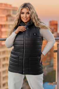 Стьобана жилетка прямого крою, подовжена, приблизно до середини стегна. Вона має комір-стійку та сріблясту блискавку по всій довжині. Модель з горизонтальними та вертикальними швами, що утворюють прямокутники.