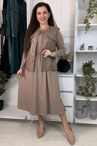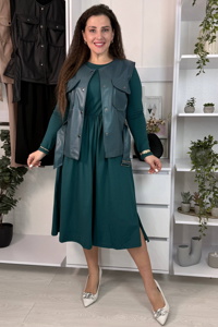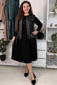 Сукня виконана з якісного турецького куліру, має довжину міді та вільний крій із легко розкльошеною спідницею, що додає образу легкості та жіночності. Жилетка виготовлена зі щільної екошкіри високої якості, застібається на металеві кнопки. Талію підкреслює пояс із пряжкою, а на грудях розташовані практичні кишені.
