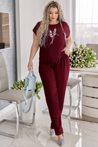 Блуза вільного силуету з модним принтом оздоблена стразами виняткової якості — кожен камінчик чарівно мерехтить на світлі. Низ блузи на кулісці, що дозволяє регулювати посадку: носити вільно або зібрано. Брюки також мають вільний крій, зручно сидять на талії завдяки еластичній резинці та доповнені зручними кишенями.