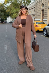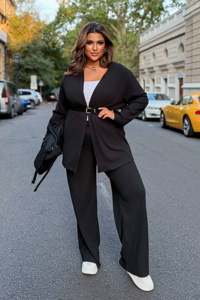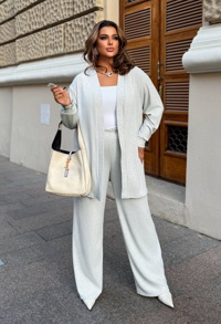 Верх складається з подовженого жакета прямого крою, який підкреслений ременем із пряжкою на талії. Жакет має глибокий V-подібний виріз. Низ – широкі штани вільного фасону, які красиво спадають і додають образу елегантності та сучасного вигляду.