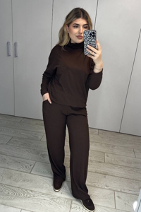 Елегантний жіночий костюм-двійка з трикотажу рубчик. Кофта оверсайз з м’якої трикотажної тканини з фактурною вертикальною смужкою. Має високу горловину-стійку та вільний крій, що забезпечує комфорт і сучасний силует.