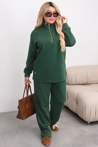 Верх — вільна кофта прямого крою з коміром-стійкою та функціональною блискавкою, що додає образу сучасного акценту й дозволяє регулювати виріз. Довгий рукав, спущена лінія плеча. Штани — широкі, прямого силуету, з м’якою посадкою, що не сковує рухів і візуально витягує фігуру.