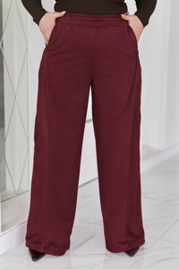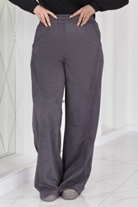 Вільний прямий крій делікатно повторює лінії фігури. Еластичний пояс м’яко фіксується на талії. Вертикальні рельєфні елементи візуально подовжують ноги. Бічні кишені з косим входом. Внизу регулятори, які стягують низ штанки.