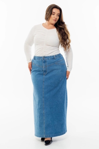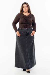 Джинсова спідниця-трапеція з продуманим кроєм, що підкреслює лаконічний силует. Спереду — кокетка та зручні кишені, ззаду — акуратний розріз, що додає комфорту під час руху.