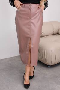 Модна шкіряна спідниця з якісного кожзаму. Довжина міді, силует прямий з розрізом спереді.