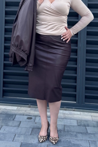 На фото з блузою "Коаліція". Образ можна доповнити шкіряною сорочкою "Апероль", щоб утворити комплект.