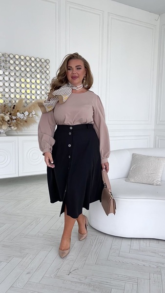 По всій передній частині спідниці розташована елегантна планка з декоративними ґудзиками. Акцент на талії забезпечується за допомогою стильних шлейок та текстильного паска. По спинці спідниці розташована еластична резинка. Також модель має внутрішні кишені.