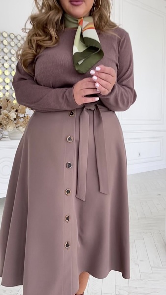 По всій передній частині спідниці розташована елегантна планка з декоративними ґудзиками. Акцент на талії забезпечується за допомогою стильних шлейок та текстильного паска. По спинці спідниці розташована еластична резинка. Також модель має внутрішні кишені.