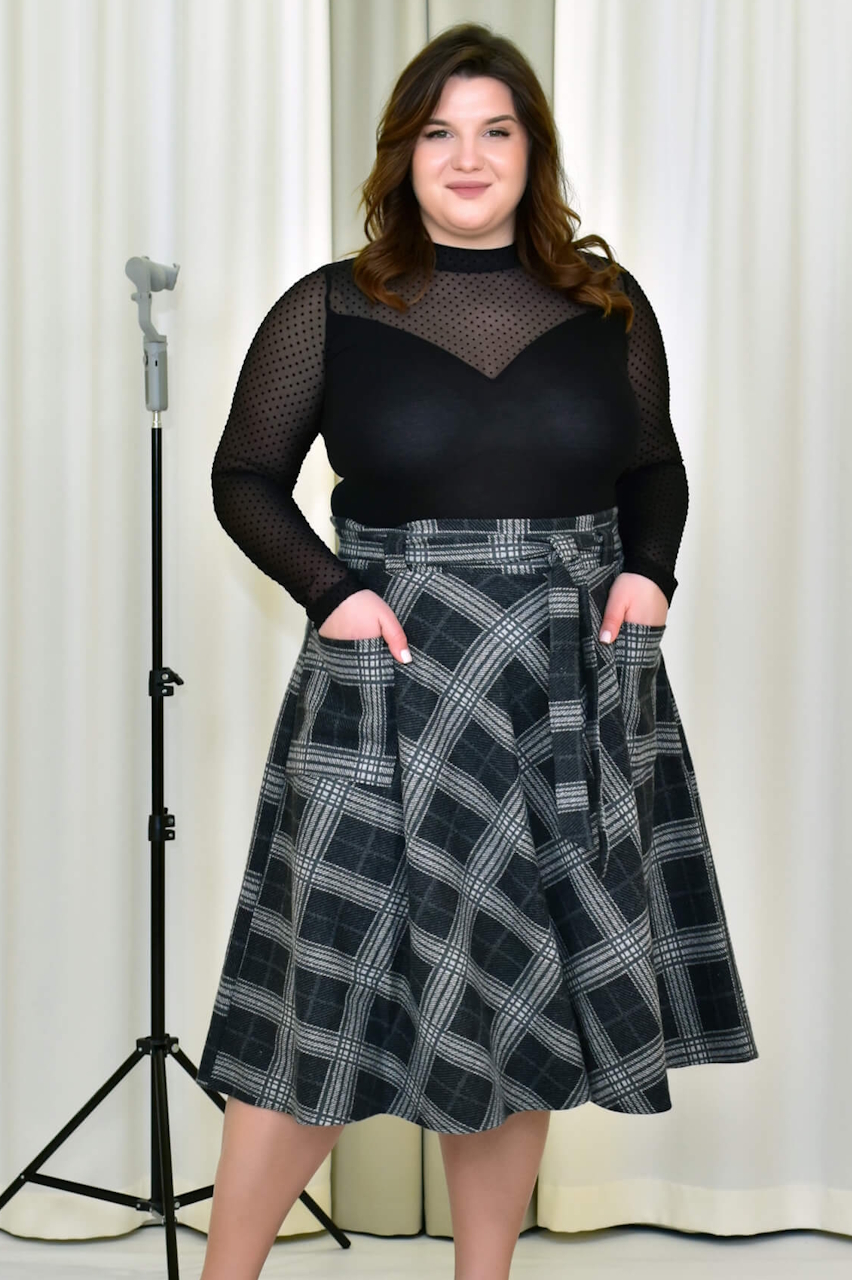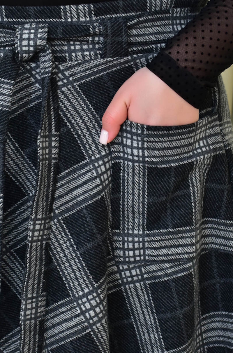 Основа виробу в клітинку. Верх на поясі. На спідниці нашиті дві кишені. По силуету - розширюється модель до низу.