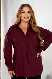Сорочка вільного крою з класичним коміром і глибоким вирізом без ґудзиків. Виріб має подовжену спинку та злегка закруглений низ, що додає силуету легкості й елегантності.