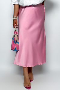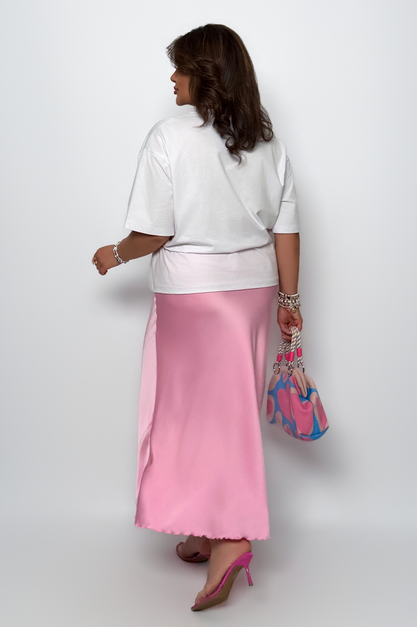 Жіночна спідниця має довжину міді, що надає образу елегантності та витонченості. Атласна тканина з характерним блиском красиво відбиває світло, створюючи вишуканий і дорогий вигляд. Матеріал додає образу жіночності, романтичності та шику, роблячи навіть найпростіше поєднання більш стильним.