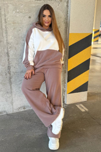 Стильний двоколірний спортивний костюм, зшитий з теплого та м'якого флісу-полару, що забезпечує максимальний комфорт і збереження тепла. Виріб складається з худі та широких штанів. Худі вільного крою (оверсайз) виконане у комбінації кольорів та має глибокий капюшон. Лінія плеча спущена. Попереду розташована велика кишеня-кенгуру. Довгі рукави завершуються манжетами.