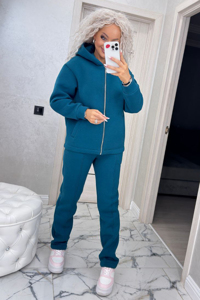 Стильний костюм виконаний з утепленого флісом трикотажу високої якості. Кофта прямого крою з приспущеними довгими рукавами на манжетах та капюшоном. Застібається на блискавку, а з боків присутні кишені, що додає практичності.