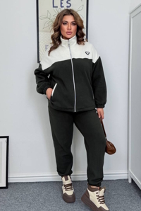 Кофта на змфйці, комір стійка, відрізна кокетка, є порізні кишені. Штани джогери, пояс та низ виробу на резинці, посадка висока.