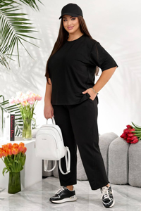 Верх ансамблю представлений базовою футболкою розслабленого вільного крою. Вона має лаконічний дизайн із класичним округлим вирізом горловини та зручними короткими рукавами, що зовсім не обмежують рухів.