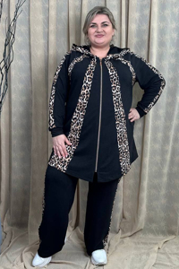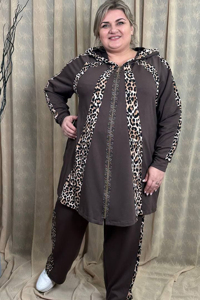 Кофта подовжена, з капюшоном, застібається на блискавку. По боках, вздовж блискавки, та на рукавах є вставки з леопардовим принтом. Штани прямого крою. Костюм має характерні елементи спортивного стилю, але завдяки леопардовим вставкам він набуває більш яскравого та оригінального вигляду.