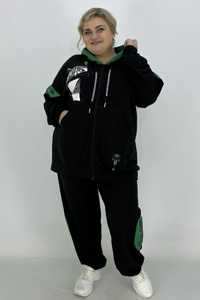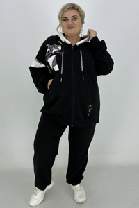 Кофта з довгими рукавами на манжетах, капюшоном на зав’язках. Застібається на блискавку по центру. Спереду розмістилась кишеня-кенгуру. Штани вільного крою, внизу на резинці. Доповнити виріб можна кросівками чи кедами.
