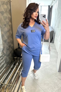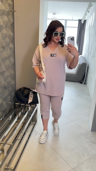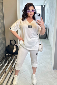 Футболка подовжена з V-подібним вирізом, вільний фасон, спущений рукав. Укорочені штани на манжетах, посадка всиока, пояс на резинці. Декор - нашивки.
