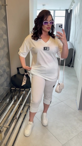 Футболка подовжена з V-подібним вирізом, вільний фасон, спущений рукав. Укорочені штани на манжетах, посадка всиока, пояс на резинці. Декор - нашивки.