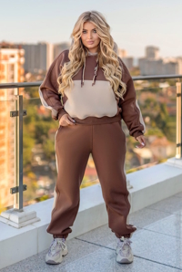 Худі: подвійний капюшон, манжети рукавів та пояса - рібана. Джоггери: висока посадка, пояс на резинці + шнурок, нижній манжет з основної тканини з гумкою, є кишені.