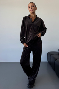 Штани прямого, вільного крою. Талія на м'якій резинці забезпечує комфортну посадку. З боків розташовані дві функціональні кишені. Цей комплект чудово підійде для створення розслабленого, але стильного образу. Він поєднує в собі комфорт спортивного костюма та елегантність велюру, що робить його ідеальним вибором для прогулянок, подорожей або затишного домашнього відпочинку.