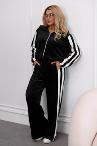 Виріб декорований двома білими смугами, що проходять уздовж зовнішнього боку кожного рукава від плеча до манжети та бокових швів від пояса до низу, візуально подовжуючи силует. Штани вільного крою, мають еластичний пояс для комфорту та бічні кишені. Костюм ідеально підходить для домашнього відпочинку, прогулянок чи подорожей.