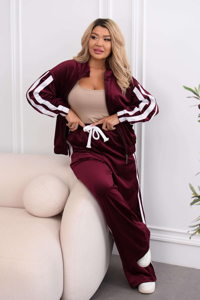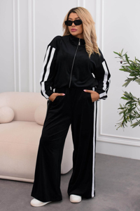Стильний костюм-двійка, виготовлений із м'якого велюру, що надає йому розкішного та комфортного вигляду. Кофта вільного крою має високий комір, який можна застібнути під горло. Застібається на блискавку по центру виробу. Особливістю є білі смуги, які проходять по рукавах, додаючи спортивного акценту.