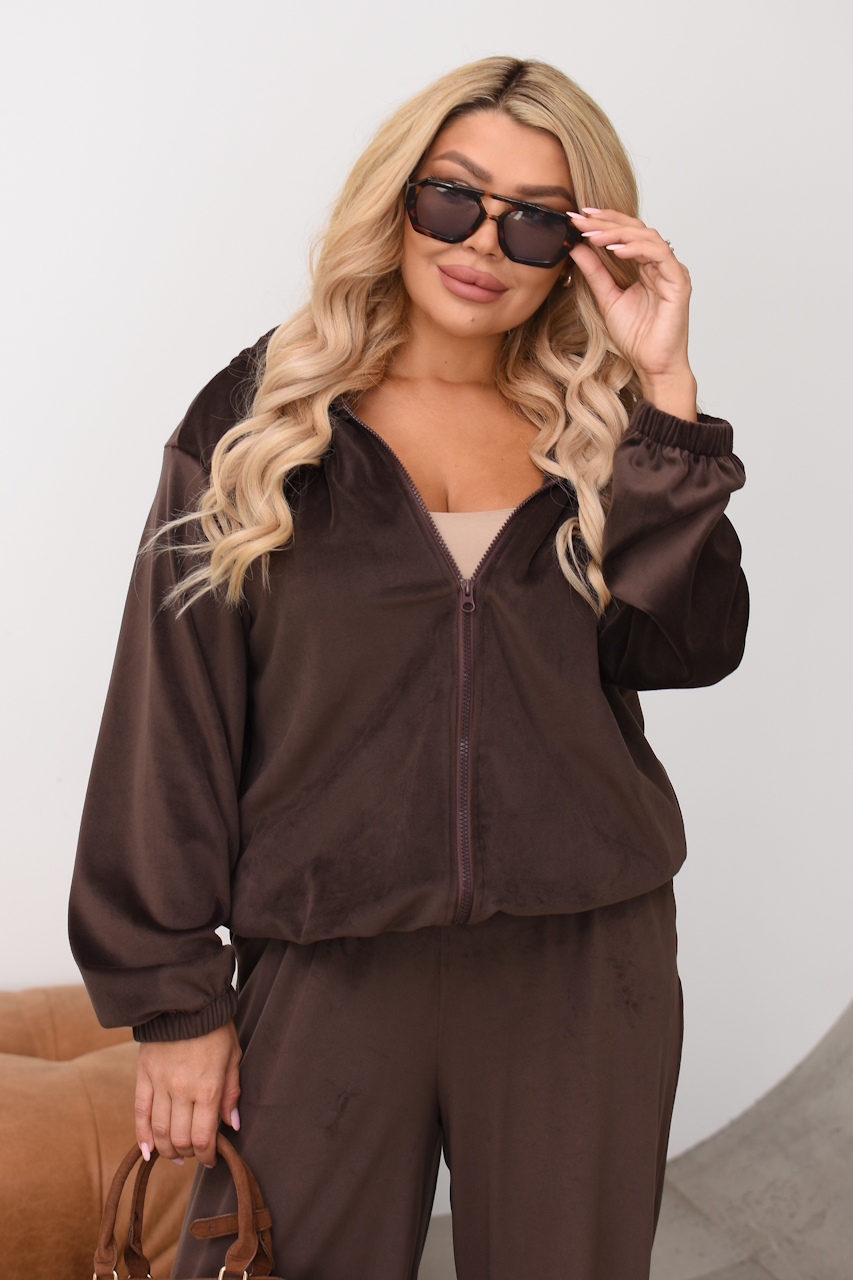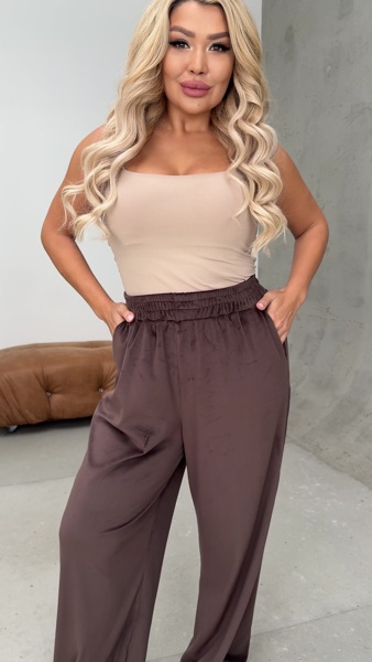 Кофта вільного крою на пластиковій змійці, рукав на резинці, понизу виробу затяжки. Штани вільні палаццо, пояс на широкій резинці, по боках кишені.