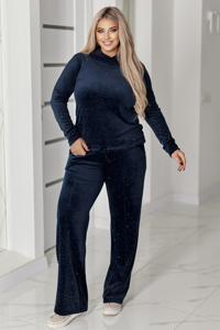 Штани комфортного, трохи звуженого крою з функціональними кишенями. Особливого шарму штанам додають стильні вертикальні стрілки, які виглядають сучасно та візуально витягують силует. Цей комплект чудово підійде для створення модного та гламурного образу для прогулянок, подорожей або затишного домашнього відпочинку, поєднуючи тепло, комфорт та розкішний декор.