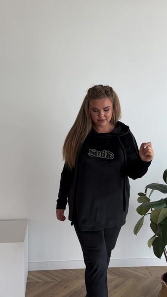 Туніка подовжена, з капюшоном, спущене плече, спереді нашивка (вигляд нашивки може змінюватися). Штани класика,п ояс на резинці, посадка висока.