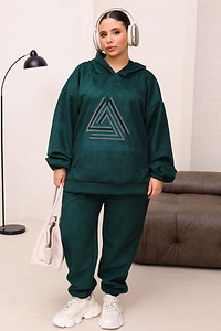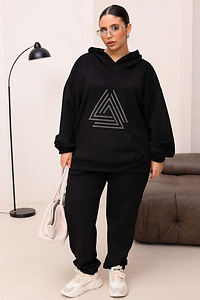 Верх ансамблю представлений об'ємним худі з практичним капюшоном. Довгі вільні рукави завершуються еластичною резинкою, а з боків кофти передбачені акуратні розрізи. Спереду розташована містка кишеня-кенгуру, над якою розміщено головний акцент дизайну – виразний геометричний принт у вигляді вкладених трикутників.