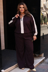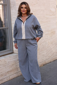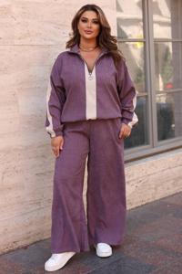 Стильний зручний костюм для повсякденних образів. Виріб складається із двох предметів. Вільний світшот на блискавці до грудей із коміром-стійкою. Рукави довгі, з резинкою на манжетах. Широкі прямі штани того ж кольору, виконані в розслабленому вільному крої.