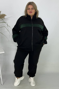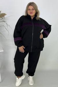 Теплий спортивний костюм, зшитий з м'якої та щільної тринитки на флісі, а також декоративних вставок зі стьобаного велюру. Таке поєднання тканин забезпечує чудове збереження тепла та оригінальний вигляд. Кофта вільного, об'ємного крою (оверсайз) з високим коміром-стійкою. Модель застібається на центральну блискавку. На грудях та рукавах розташовані контрастні вставки зі стьобаного велюру, що додають виробу фактурності та акценту.