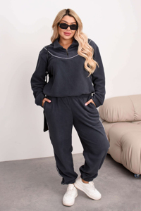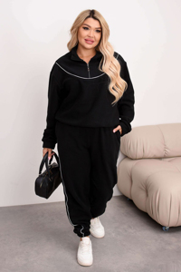 Затишний спортивний костюм, зшитий із щільного двостороннього флісу. Цей матеріал забезпечує м'якість, комфорт та прекрасне збереження тепла. Виріб складається зі світшота та штанів-джогерів. Світшот вільного крою (оверсайз) з високим коміром-стійкою. Спереду розташована коротка застібка-блискавка. Горловина та спущена лінія плеча підкреслені декоративним кантом контрастного кольору. Низ світшота та рукава зібрані на м'який манжет.
